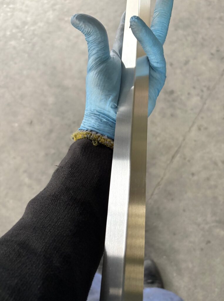 今回はアングル形状となっているので1面ずつヘアライン加工をしました。面で分けずに一発で
